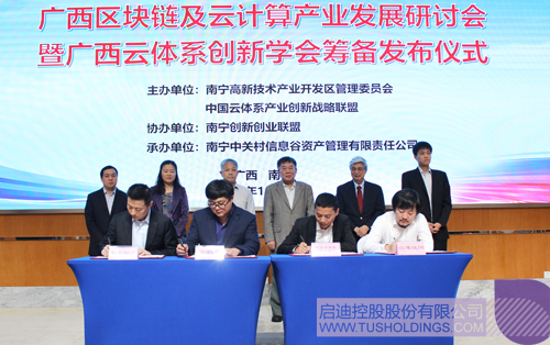 10月22日,在廣西南寧舉辦的廣西區(qū)塊鏈及云計(jì)算產(chǎn)業(yè)發(fā)展研討會(huì)上,啟迪鏈網(wǎng)集團(tuán)和中國云體系產(chǎn)業(yè)創(chuàng)新戰(zhàn)略聯(lián)盟、平安科技有限公司、南寧中關(guān)村信息谷共同簽署戰(zhàn)略合作協(xié)議。廣西自治區(qū)科技廳副廳長劉建宏、原中國投資有限責(zé)任公司副總經(jīng)理謝平、瑞典皇家科學(xué)院院士林垂宙、南寧高新技術(shù)產(chǎn)業(yè)開發(fā)區(qū)管委會(huì)副主任左偉見證簽約。